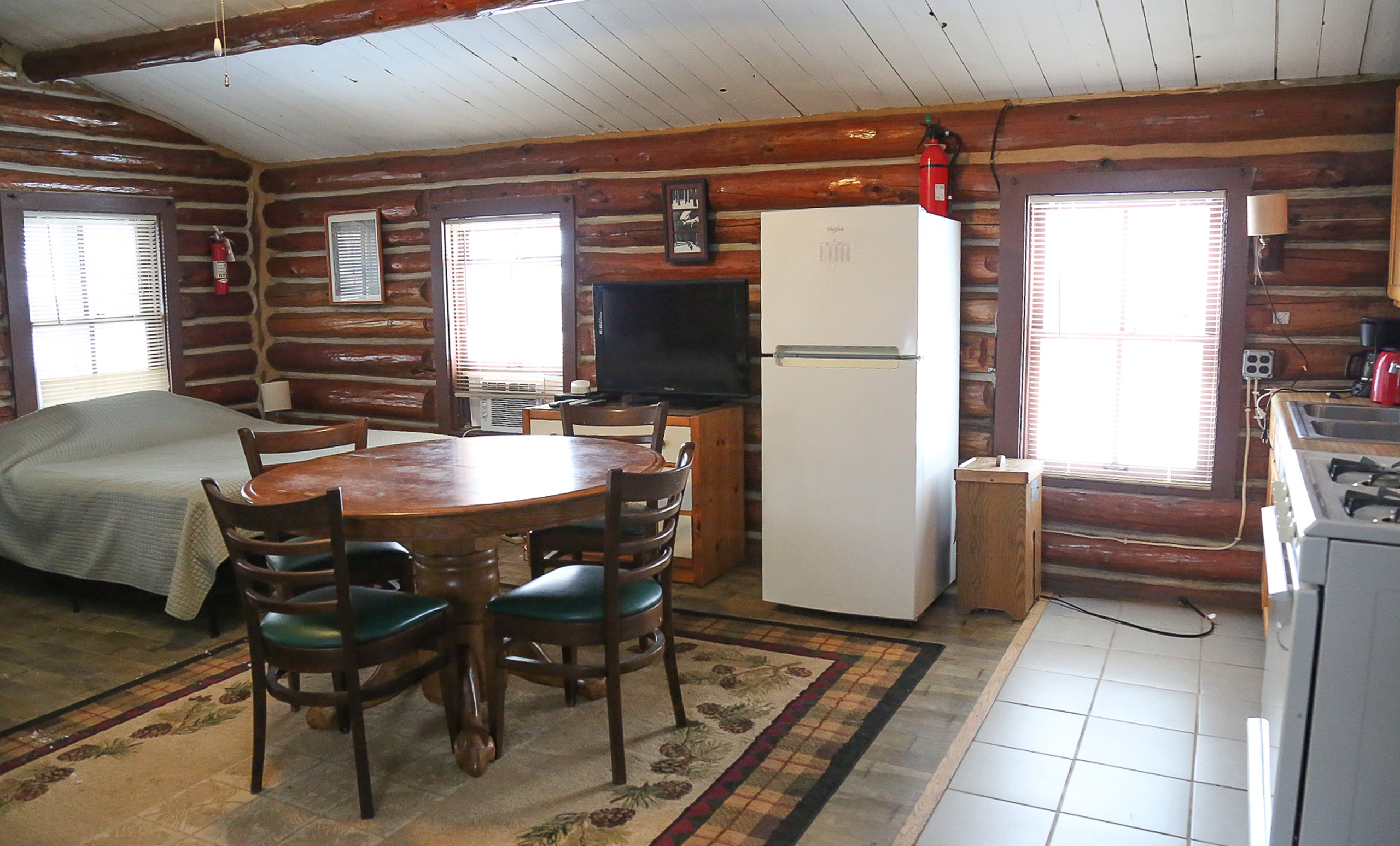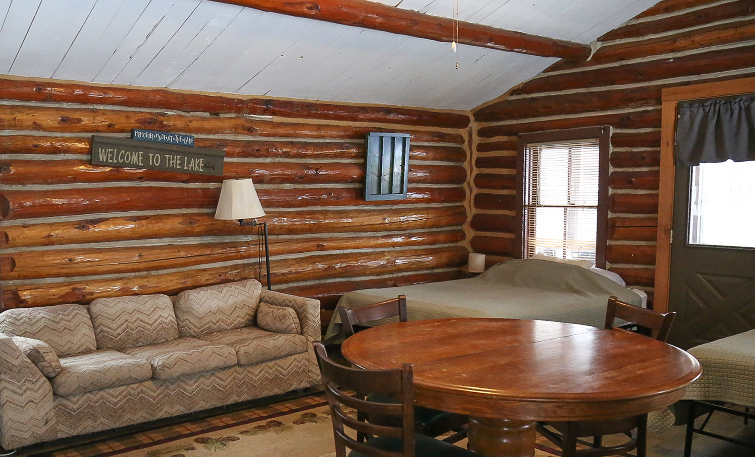 Duck Inn, one of the oldest cabins at the resort, features two queen beds that can accommodate two people each, plus a sofa, full kitchen, and air conditioning; it also features a new (2016) three-seasons screened in porch off of the front of the cabin, and a charcoal grill, picnic table, and fire ring.