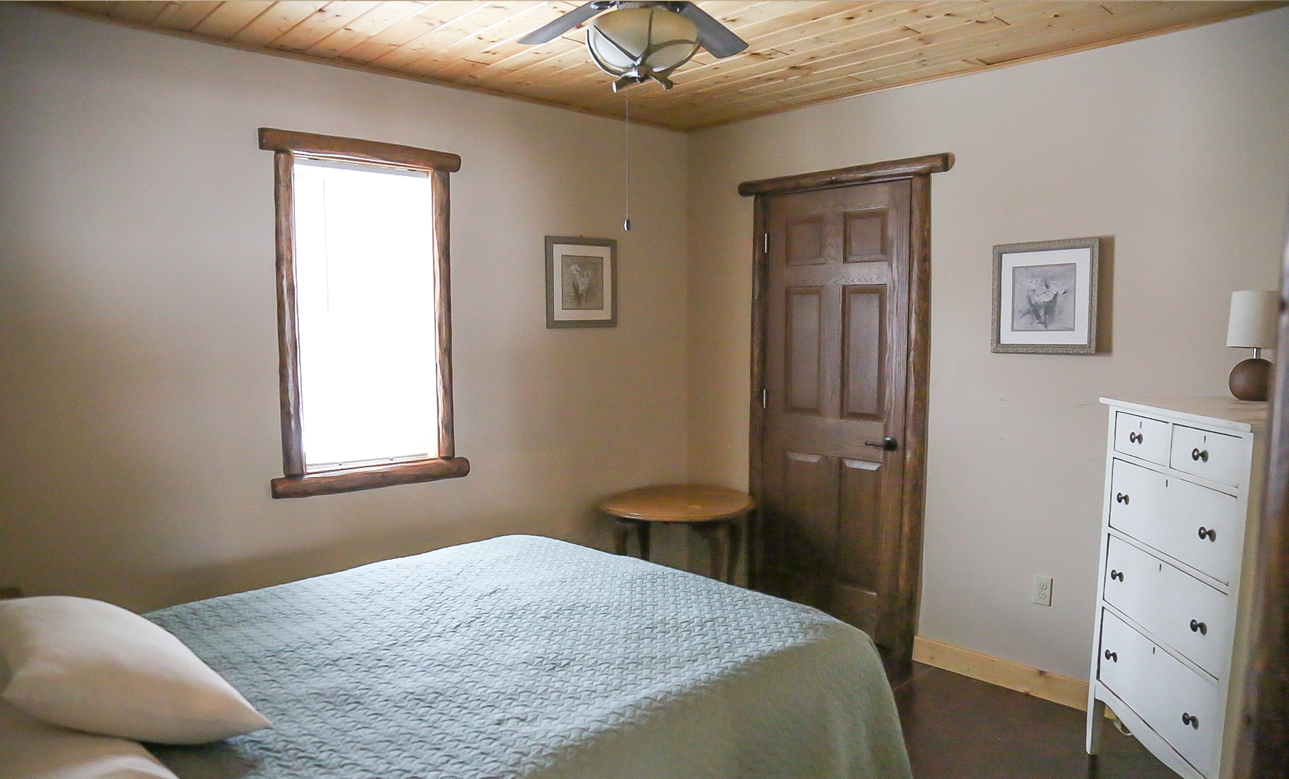 Built in 2014, this two-bedroom with queen size beds, sleeps four, and has a fold out sofa for two extra people. Moose Manor has a full kitchen, full bathroom, air conditioning in-floor heat for winter. The cabin features a large, three-season porch, and fireplace. Outside you’ll find a charcoal grill, fire pit, and picnic table.