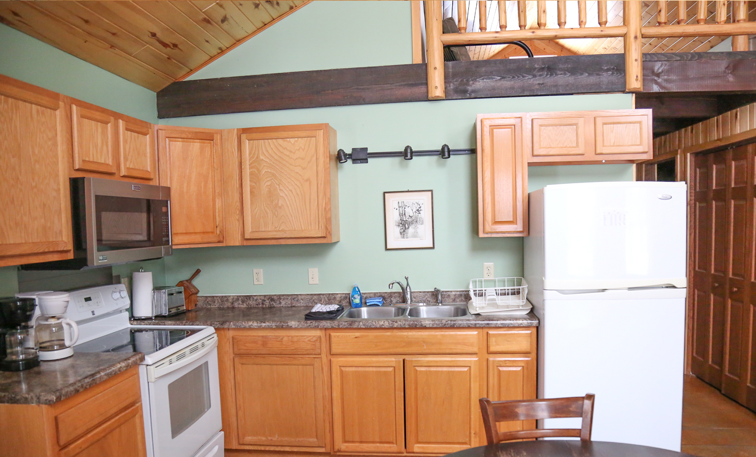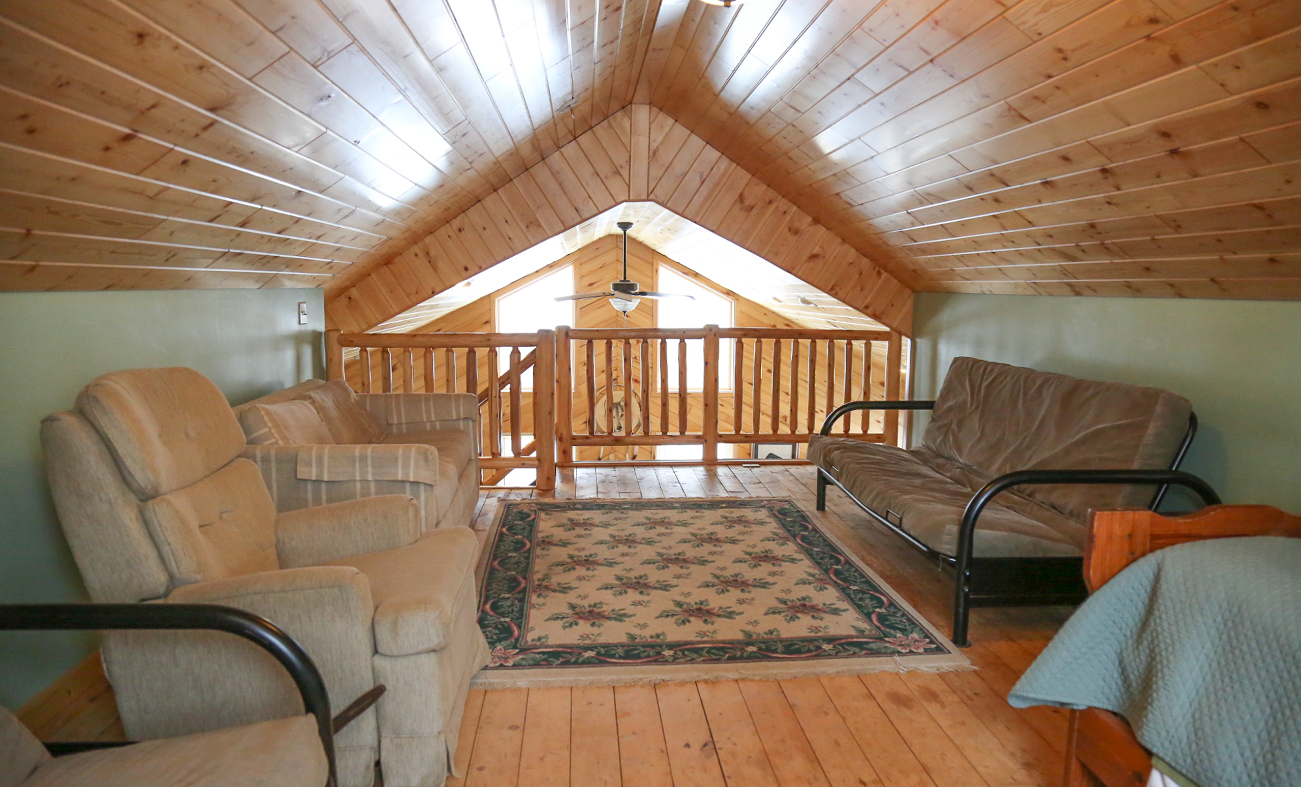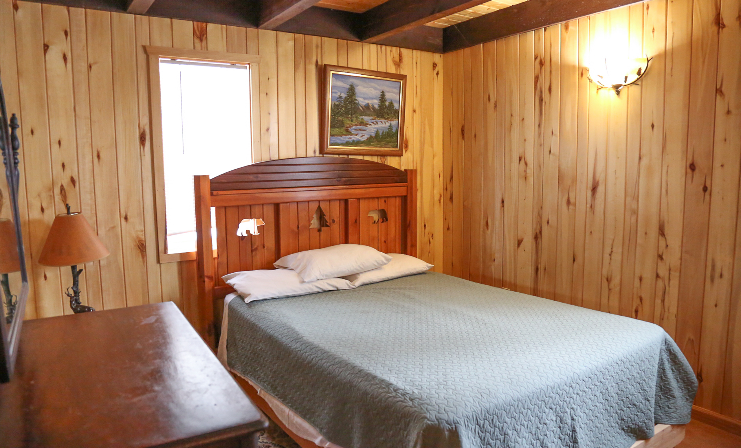 Our newer cabin features three bedrooms on the main floor, plus a huge loft above for a very large fourth bedroom, as well as 1.5 bath, which includes a bathtub. The cabin comfortably sleeps 13 people, and features three queen sized beds, one twin, two futons, and a fold out couch, a full kitchen, and bathroom, air conditioning, and in-floor heat for winter. There is also a screened in porch, fire pit, & charcoal grill.